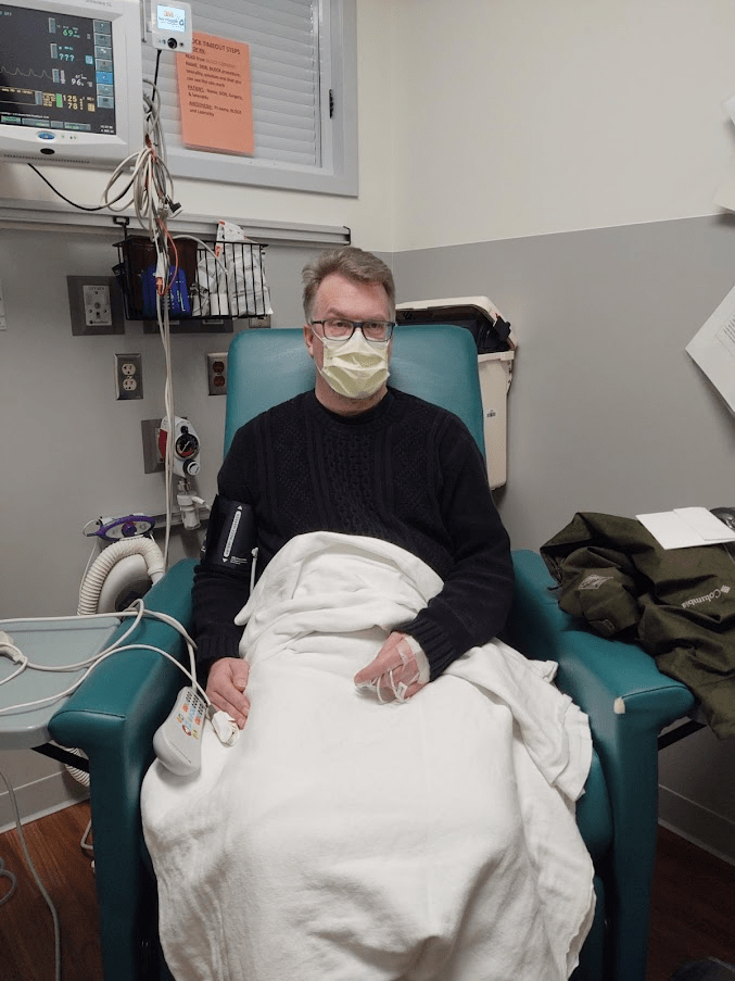 Here’s a picture of me in the chair. I figure the mask anonymizes it enough, and I really don’t care if it doesn’t. So that works out.