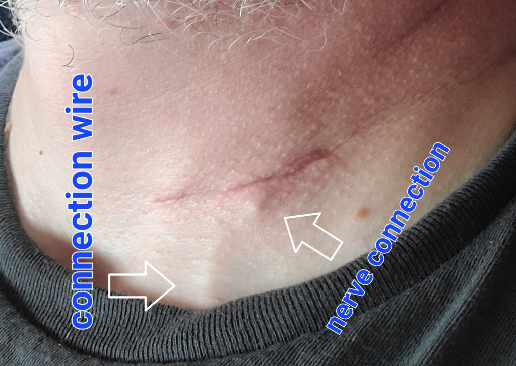 What’s interesting though is that you can see and feel some of the electronics. The connector is a small bit of wire which is wrapped around the Vagus nerve. It’s then doubled back upon itself and run to the device implanted just below my collarbone. The nerve connection is a little lump at this point and not only can you see it (not a zit) but you can feel it. Which is a little odd feeling.